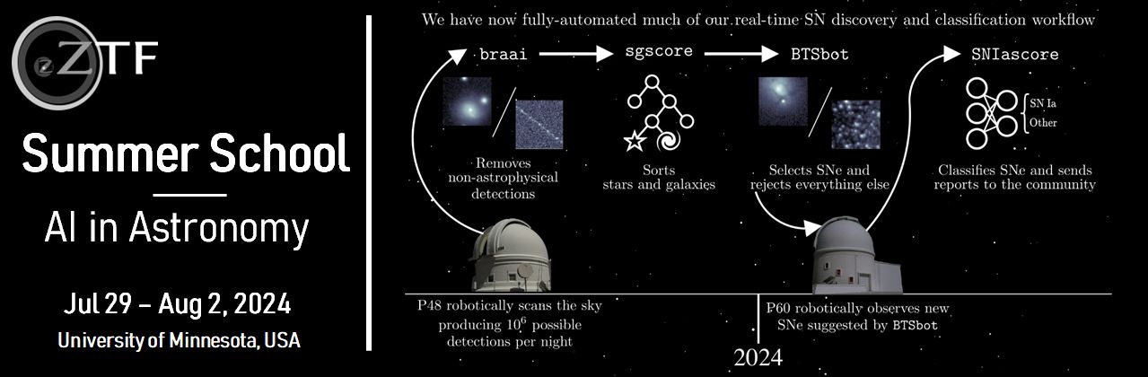 This year's theme for the ZTF summer school is AI and machine learning in time-domain astronomy. The program will have a special focus on unsupervised and supervised learning, deep learning, simulation based inference and more. Best suited for graduate students and above, the school offers a week of hands-on training with Python Jupiter notebooks under the guidance of experts in the field. This year, we will wrap up with a special data challenge to apply the newly learned skills. Students will mainly work with astronomical data from the ZTF survey and other transient survey data.